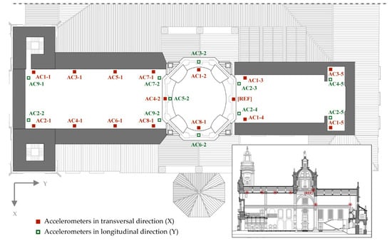 The vibrations were measured at the top of the walls of the nave, dome, and chancel, in both the transversal (X) and longitudinal (Y) directions of the church, for five different configurations (