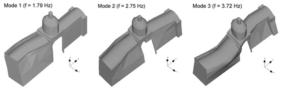 First three modes of vibration estimated by the Stochastic Subspace Identification based on Unweighted Principal Component (SSI-UPC) method.