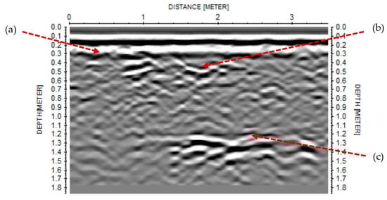 Horizontal georadar reading on the south wall of the nave: (a) inner surface of the interior leaf at 35–40 cm depth; (b) inner surface of the interior leaf at 55 cm depth (irregular inner surface); (c) opposite side (inner surface of the exterior leaf) at 1.20–1.25 m depth.