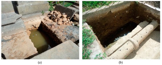 Water table visible in the inspection trenches days after the excavation (summer period). (a) Excavation 1: water level at −0.93 m below the nave floor; (b) Excavation 3: water table at −1.10 m measured from the floor of the nave.