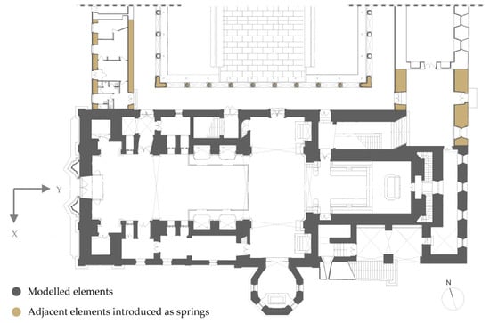 Figure 7). The stiffness of the structural elements of the monastery adjacent to the church (orthogonal walls and columns of the cloister) was considered in the model by means of spring elements. Since it was not possible to inspect the roofs of the transept and the chancel, the truss elements in these areas were idealized according to the known roof structure above the nave.