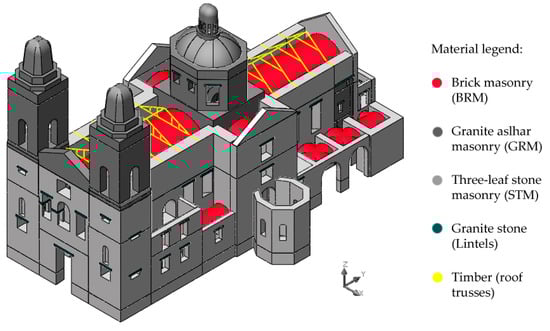 As it was mentioned before, the visual inspection and georadar tests allowed us to identify the different types of materials that compose the structure of the church, namely brick masonry (BRM–vaults), ashlar masonry (GRM–walls behind the high altar, arches in the crossing, top part of the towers, and dome), three-leaf stone masonry (STM–main walls and rest of masonry elements), granite units (lintels), and timber (roof truss structure).