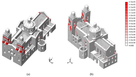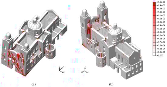 Crack width associated with the maximum principal strain at the end of the capacity curve for the pushover analysis in the positive transversal direction (+XX). (a) South-West view; (b) South-East view. Units in m.