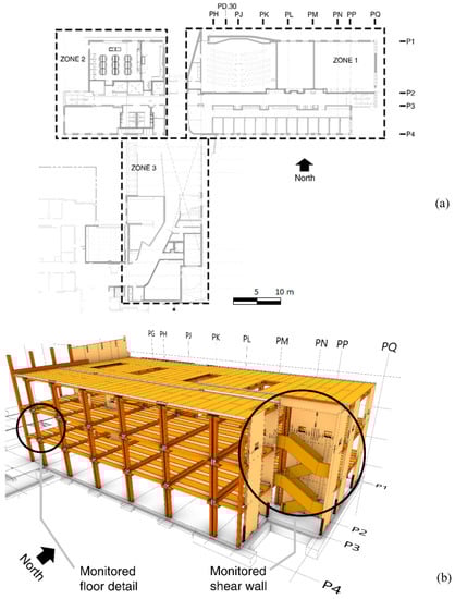 - Wang, J.; Karsh, E.; Finch, G.; Chen, M. Field Measurement of Vertical Movement and Roof Moisture Performance of the Wood Innovation and Design Centre. In Proceedings of the WCTE 2016 World Conference Timber Engineering, Vienna, Austria, 22–25 August 2016; No. Lvl. pp. 2–3. [Google Scholar]