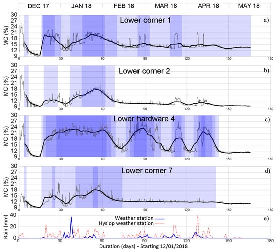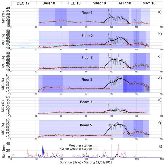 - Floor elements erected earlier in construction showed much higher MC gain and longer periods of time spent above the fiber saturation point, than the roof erected later;