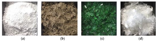 Components used in the experimental campaign. (a) Cement; (b) Fine aggregate; (c) Coarse aggregate (recycled glass); (d) Fibers.