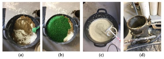 Process of manufacturing the specimens. (a) Dry mixture of components; (b) addition of the glass grains and water; (c) mixture with mortar mixer 550 W and 0/2600 rpm; (d) compaction with a rod.