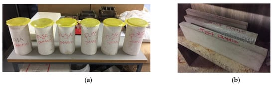 After the curing period, specimens were cut 24 h before with the help of a machine, with the purpose of lowering between 5 mm and 10 mm of the upper face to get a smooth and, above all, a flat surface. The upper face was treated with a protection based on sulfur in order to assure a proper loading on the top and the best distribution of stresses during the application of load (see Figure 5).
