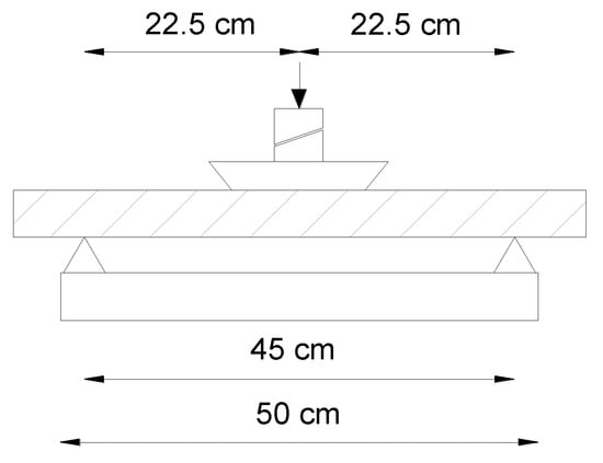 A single-point load test was used to determine the ultimate bending strength of the proposed rectangular specimens. The two supporting edges were separated by a distance of 45 cm from each other (see Figure 7) according to the ASTM C 293-02 Standard test method for the flexural strength of concrete using a simple beam with center-point loading []. Once the specimen was placed in the correct position the load was applied slowly in the mid-point of the element in order to measure deflections until the collapse. Load-deflection curves were obtained from tests by using extensometers (see Figure 8).