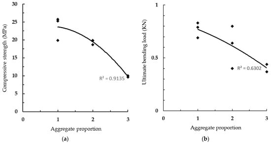 Strength and load evolution depending on the recycled aggregate proportion. (a) compressive strength; (b) ultimate bending load.