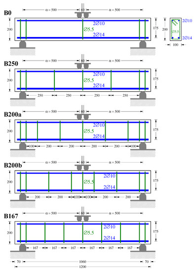 The first part of the conducted test project includes five RC beam specimens 1.2 m long with rectangular cross-section subjected to four-point monotonic loading. The beam characteristics are; width to height ratio b/h = 100/200 mm, effective depth d = 175 mm, shear span α = 500 mm, and shear span-to-depth ratio α/d = 2.86, as presented in Figure 1.