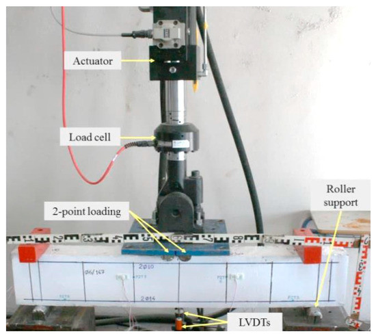 Beams were subjected to monotonically increasing load up to total failure based on the test setup depicted in Figure 2. Beams were edge-supported on roller supports using a rigid laboratory frame. The load was imposed by a 200 kN hydraulic actuator at two points at the mid-span of the beams (four-point bending scheme). The magnitude of the load was recorded by a load cell with an accuracy of 0.05 kN attached to the actuator. The load was provided monotonically at an increment of 5 kN before the onset of the diagonal concrete cracking adopting force control method, while the displacement control method was used afterwards. The average net mid-span deflections of the tested beams were recorded by four linear variable differential transducers (LVDTs, Kyowa, Tokyo, Japan) with 0.01 mm accuracy. To increase accuracy of the measured deflections, two LVDTs were placed in the mid-span of the beams and the other two in the supports. Measurements of load and corresponding deflections were read and recorded continuously during the performed tests.