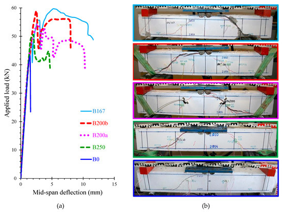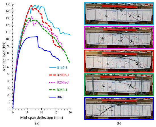 (a) Experimental behavior of the jacketed beams in terms of applied load versus mid-span deflection; (b) cracking patterns at failure.