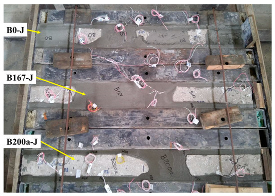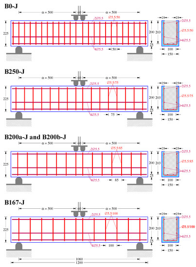 This way, the five jacketed RC beams are 1.2 m long with gross (total) width bj = 150 mm, height hj = 225 mm, effective depth dj = 203 mm, shear span a = 500 mm, and shear span-to-depth ratio a/dj = 2.46, as presented in Figure 4. All jacketed beams have the same additional longitudinal reinforcement; 2∅5.5 bottom bars, 2∅5.5 side bars, and 2∅5.5 top bars. The reinforcing bars of the jacket have been placed directly on the concrete surface of the existing beam, supported by L-shaped ∅5.5 dowels that were epoxy-bonded into holes in the vertical sides of the beams, as shown in Figure 5 and Figure 6. Further, jacketing includes extra U-shaped transverse reinforcement at spacing that varies; 50 mm in the beam with the codified name “B0-J”, 75 mm in beam “B250-J”, 85 mm in beams “B200a-J” and “B200b-J”, and 100 mm in beam “B167-J” (Figure 4).