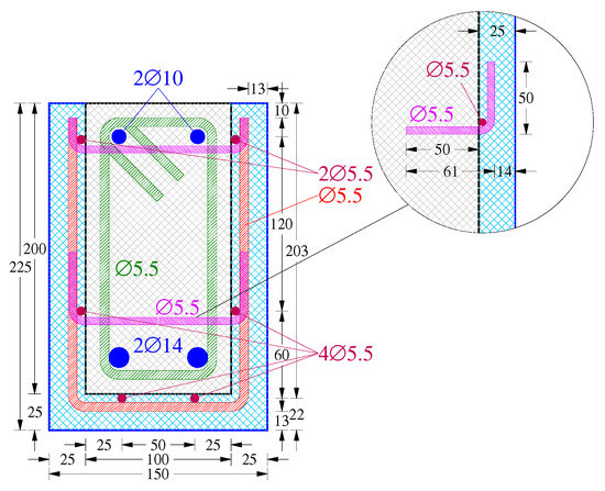 As depicted in Figure 5, the clear cover of the steel reinforcement (U-shaped stirrups and dowels) in the proposed thin jacket is rather narrow (14 mm), causing potential durability and steel corrosion issues. According to the provisions of EC2 [60], the minimum cover requirements with regard to durability is 10 mm for structural class S4 (recommended structural class for design working life of 50 years) and exposure class X0 (concrete inside buildings with very low air humidity) or 15 mm for structural class S4 and exposure class XC1 (light hazard of corrosion induced by carbonation), without taking into account any additional protection, such as coating, that could further reduce the minimum cover required (10 mm is the lower limit). Further, the jacketing mortar is a cement-based flowable grout with advanced properties such as high strength, excellent freeze/thaw, oil and water resistance, containing no chloride, and shrinkage compensated. Thus, durability and corrosion effects are rather limited in nonaggressive environmental conditions. However, each repair or strengthening technique has its advantages and drawbacks. Thus, although the applied cementitious mortar jacket is less sensitive to fire hazards, high temperature, and freeze–thaw effects, it has obviously lower corrosion resistance compared to FRP composite jackets [22,24].