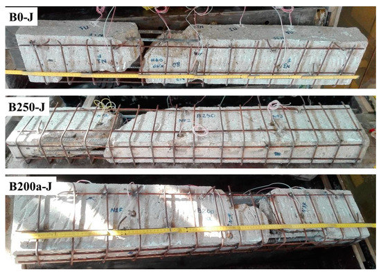 Concerning the overall behavior of the retrofitted beams, they seem to have an initial stiff response, practically an “elastic” branch up to a load of approximately 25 kN, until the first flexural cracking appears from the bottom surface at the mid-span of the beams. Subsequently, as the imposed loading increased, the developed cracks spread out and diagonal cracking gradually formed near the supports crossed by the U-shaped stirrups (onset of the shear cracking at load approximately 90 kN). Further increase of the applied load causes an increase of the number, the length, and the width of the inclined cracks. Usually, the initial diagonal crack becomes wider than the subsequent inclined cracks and eventually this crack developed as the critical. Consequently, all retrofitted beams failed in shear. Spalling of cover of the jacketing cementitious mortar was also observed close to the bottom ends of the inclined cracks, due to local decrease of the compression zone depths at those sections resulting from the existence of the shear cracks. Debonding failure between the core concrete of the initial beam and the mortar of the jacket has not been observed before the development of the critical diagonal cracking and the ultimate capacity of the retrofitted beams. This fact indicates that the interface treatment applied and described previously in the repair procedure proved to be efficient since adequate bond strength has been achieved. The importance and the influence of proper surface preparation and installation of the jacketing reinforcement on the strength of the jacketed RC beam have long been recognized [61,62].