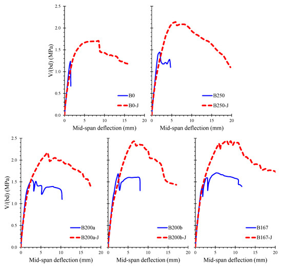 The experimental curves of average shear stress versus mid-span deflection of the initially tested beams are compared with the curves of the corresponding retrofitted and retested beams in Figure 9. From these comparisons, it is obvious that the applied jacketing technique successfully rehabilitates the heavily shear-damaged beams since the shear strength has been fully regained and the overall performance has been improved significantly.