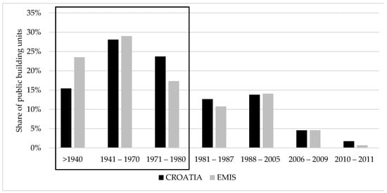 Figure 1. Share of public building units in Croatia and in the Energy Management Information System (EMIS) database according to the year of construction.
