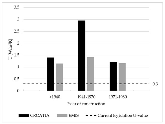 Since the majority of the heat losses occur through external walls and the thermal insulation of external walls represents the most commonly used measure when performing energy renovations, the U-values of walls contained in the database were analysed in greater detail and compared with characteristic U-values for the first three periods of construction for the continental part of Croatia (Figure 2). At this point, the maximum value of the thermal transmittance coefficient (U-value) that must be met for external walls is set to 0.30 W/m2K for the continental part of Croatia, where an average monthly air temperature of the coldest month is less than or equal to 3 °C [10]. As can be seen from Figure 2, characteristic U-values at the national level are somewhat higher compared to the values obtained as an average from the EMIS database for each construction period. The following can be explained by the fact that some of the buildings in the database have been partly renovated in the past. Furthermore, the number of valid samples varies depending on the construction period analysed, since all buildings may not have the same construction materials due to user negligence [37]. However, there is a general lack of valid entries of U-values in the database, preventing it from being considered as representative of the national building stock. Furthermore, the average U-values from the database, though they are lower than characteristic values of the national stock, do not meet the minimum energy performance requirements of the current legislation. Hence, further analysis relies on characteristic U-values of building elements defined at the national level.