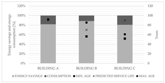 The range of energy savings for the three case studies is shown in Figure 3. For Building A, energy needs decreased by around 82%, for Building B around 89%, and for Building C around 81% after the renovation. In terms of building age, the service life of characteristic building materials for each period was observed, taking into account the payback period for the total initial investment. The service life of 90 years for brick wall (characteristic of the first period of construction) and hollow brick (characteristic of the third period of construction), and of 70 years for reinforced concrete (characteristic of the second period of construction), was compared to the building age at the moment of the return of investment (Figure 3) [45]. Considering the construction period range, the minimum and maximum possible age of buildings after the payback period are shown in Figure 3. For the first period of construction, only the minimum age was calculated, which corresponds to the year of construction of 1940 since this minimum already exceeds the service life of material used for building construction. It can be seen that the age of all buildings from the first period of construction after the return of investment will be higher than the predicted service life; the same refers to buildings constructed before 1956 in the second construction period. Therefore, a more comprehensive approach should be applied when considering the energy renovation of existing building stock into nZEB since some buildings are very old and require substantial reconstruction aside from the improvement of thermal properties, which can make the feasibility of energy renovation questionable.