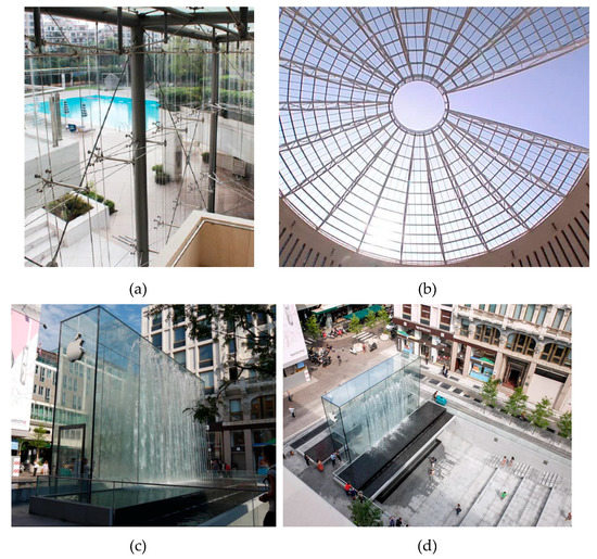 Glass in buildings for (a) facades (reproduced from [14] with permission from Elsevier, license n. 4580680789049, May 2019); (b) roofs or (c,d) other load-bearing architectures (example for Piazza Liberty in Milano, Italy).