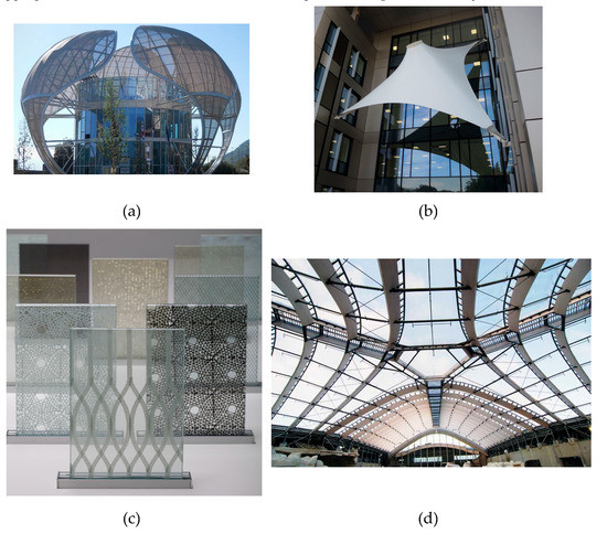 Selected examples of textiles in glass facades and assemblies: (a,b) textile facades with shading membranes (reproduced from [25,26]); (c) glass textile samples (Tex Glass® reproduced from [27]); and (d) textiles for enhanced acoustic comfort of glass halls (reproduced from [28]).