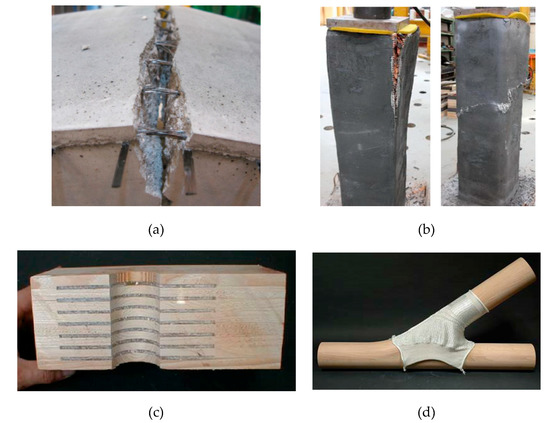 Examples of (a) textile reinforced concrete slab with carbon fiber mesh (reproduced from [39]), or (b) masonry column (reproduced from [40] with permission from Elsevier, license n. 4580730591053, May 2019), and (c,d) timber joints. (c): timber specimen with embedded knitted fabric reinforcement (cross-section; reproduced from [41]); (d) 3D knitted reinforcement for a solid connection (reproduced from [42] with permission from Springer Nature, license n. 4580731288540, May 2019).