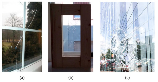 Examples of relevant damage in glass: (a) thermal shock; (b) melting of the interlayer foil, due to high temperature exposure (Zagreb University, Croatia–VETROLIGNUM Project); (c) fracture due to impact.