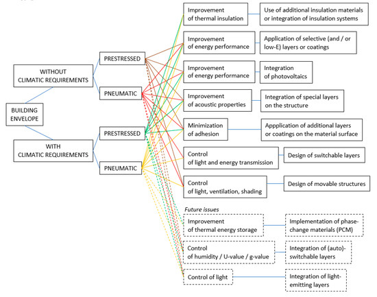 Especially in facades, the use of textiles offers a relatively wide set of possible configurations. Most of them can mainly involve shading systems and/or architectural components (Figure 2), while some others are specifically intended to improve the acoustic performance, and/or the thermal response, etc., of a given system. Based on [53] and Figure 6, it is generally recognized that the typical use of textiles and fabrics in building envelopes can aim at enhancing thermal insulation, light, and energy performances.