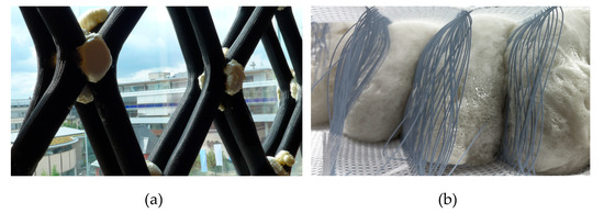In the case of timber structures, textiles can offer certain structural benefits especially in the form of reinforced joints, see Figure 3c or Figure 3d and [48,49,50]. Apart from the multitude of advantages that can derive from the use of textiles in timber engineering, however, major restrictions and limits could derive from the different thermal performance of the involved materials. Apart from the availability of consolidated knowledge for textile-reinforced timber structures [51], the topic still attracts novel efforts, as a result of a continuous evolution in materials and techniques, and thus a progressive development and refinement of calculation approaches.