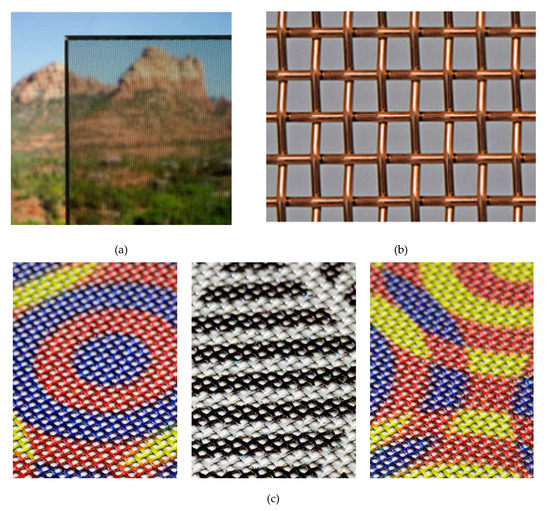 Examples of textile glass: (a) front view with (b) mesh detail, or (c) selection of possible coloured mesh fabrics (reproduced from [71]).