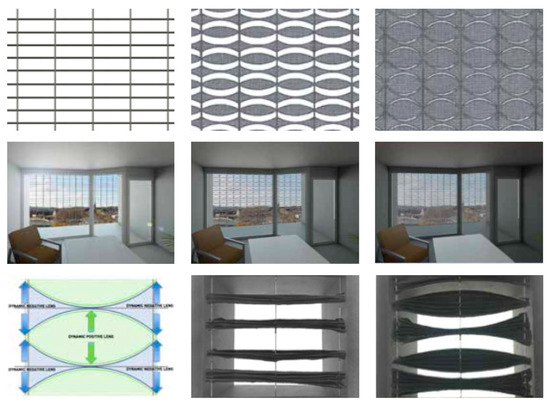As far as the above concepts are further elaborated, the final result can take the form of adaptive textiles able to ensure repeated dynamic performances within a given glass facade [72], Figure 11. According to [73,74], the design challenge is hence even more complex, due to the need of combining multiple performance parameters and requests (i.e., shading, visual comfort, thermal performance, etc.) with typically mechanical issues and design aspects to assess for safety purposes [75], both static and dynamic.