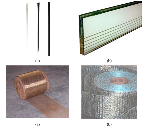 Examples of (a) textile rods acting as (b) embedded reinforcement in laminated glass beams (figures reproduced from [82] with permission from Elsevier, license n. 4581301243094, May 2019), as alternative to (c,d) embedded ultra-high tensile strength steel or (d) stainless steel fibers (reproduced from [83] under the terms and conditions of CC BY license).