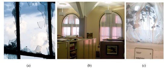 Due to the relatively high vulnerability of glass windows and facades, one of the recent applications of textiles in existing structures can take the form of special curtains, aimed at protecting the occupants in the case of extreme loads, such as impacts and explosions (Figure 14 and [85]), but also fire [86].