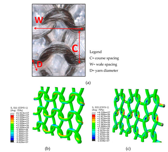 An example of refined FE modelling of textile structures: (a) Microscopy image of the reference knitted textile architecture, with evidence of local stresses due to mechanical interactions; (b) in-plane and (c) out-of-plane stress peaks (values in Pa; figures reproduced from [94] with permission from Elsevier, license n. 4581300089691, May 2019).