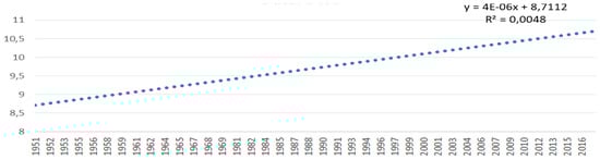 The trend line for air temperature increase in °C at a height of 2 m, Berlin-Tempelhof from 1951–2017, based on hourly values, n = 289.747 data sets [source: d, DWD].