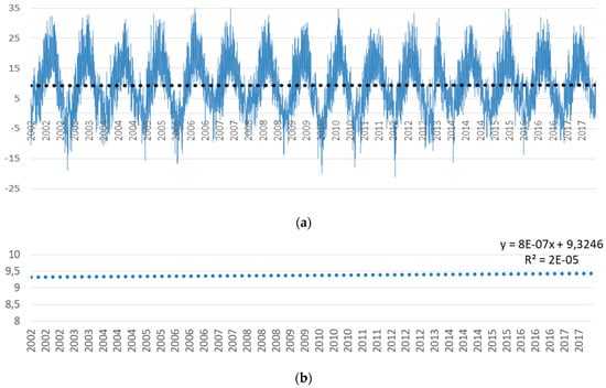(a) Hourly air temperature at 2 m in °C, NB-Trollenhagen from 2002–2017, [], based on own calculation. (b) Air temperature trend line from 2002–2017, NB–Trollenhagen, [].