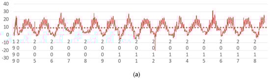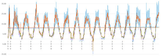 In order to visualize these series of statistical values, the annual values of all of the data have been aggregated to daily amplitudes and were adapted for this article (in Figure 2, Figure 3, Figure 4, Figure 5, Figure 6 and Figure 7) using the more appealing presentation graphs provided by Excel.