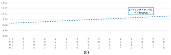 (a) T1m: Air temperature 1 m in °C above the roof vegetation, 1999–2018, UAS Neubrandenburg; own measurements. (b) Trend air temperature T1m, in °C UAS Neubrandenburg; own measurements.