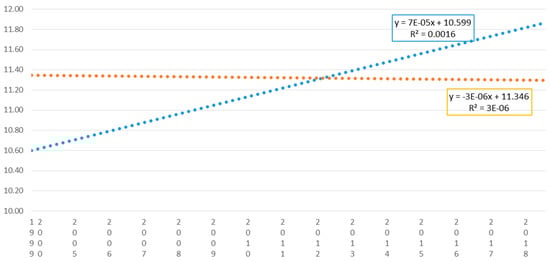 The trend surface temperature (green roof: Red line), (gravel roof: Blue line) in °C, UAS Neubrandenburg, from the years 1999–2018; own measurements.