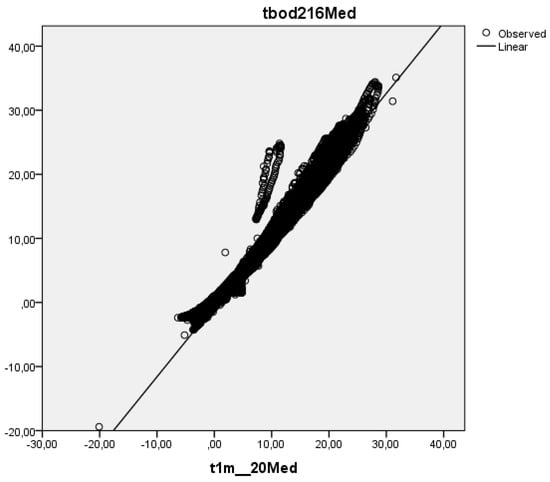 A scatterplot of the regression analysis of the complete data set since 1999, with strong dependence of the air temperature 1 m above the roof (t1m) and the dependent surface gravel temperature (Tbod).