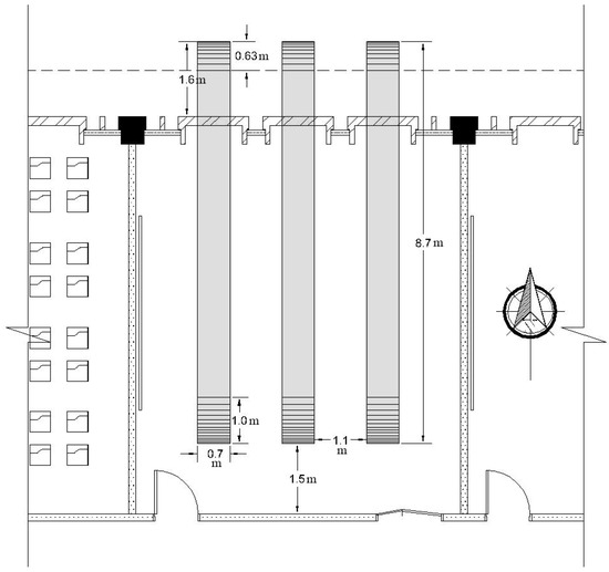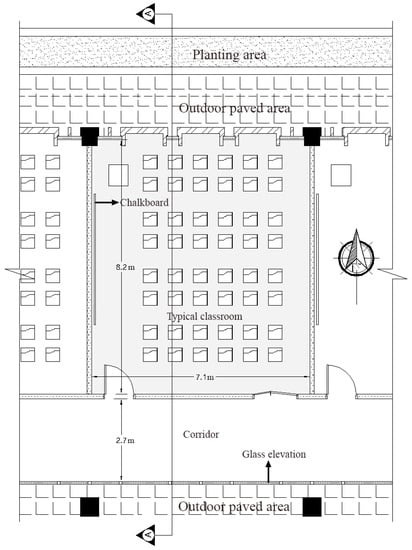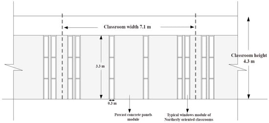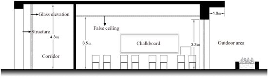 A sample classroom, located on the ground floor, representing about 60% of typical classrooms of JUST, is chosen. The dimensions of the classroom are 7.1 m long and 8.2 m wide. All the classrooms at JUST are accessed through single loaded corridors of 2.7 m width, as seen in Figure 1. The classroom is 3.5 m high, ending with a 0.8 m false ceiling, as illustrated in Figure 2. The classroom is side-lit by vertical and narrow openings directed toward the north. The windows are 0.3 m in width and 3.3 m in height. The glazing of the windows is 6 mm clear single-pane glass. The window-to-wall ratio (WWR) is 19%. The floors above the classroom create a projection of 1 m over the windows. The typical capacity of each classroom at JUST is 48 pupils.