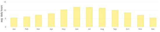 The study is conducted at JUST, Irbid/Jordan. JUST’s geographical coordinates are 32.5 North and 36 East. Figure 4 shows the average daily sunshine of Irbid. The minimum hours of sunshine occur from December to January with 5.4 hours, and the maximum in June with 11.9 hours. The average annual sunshine in Irbid is 8 hours.