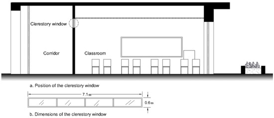 Table 3. Measured and suggested values of materialsˈ reflectance. - Case No.2: In this case, a clerestory window was constructed at the common wall between the classroom and the corridor, as illustrated in Figure 7. The window was double-glazed for acoustic purposes and had a transmittance value of 0.65.