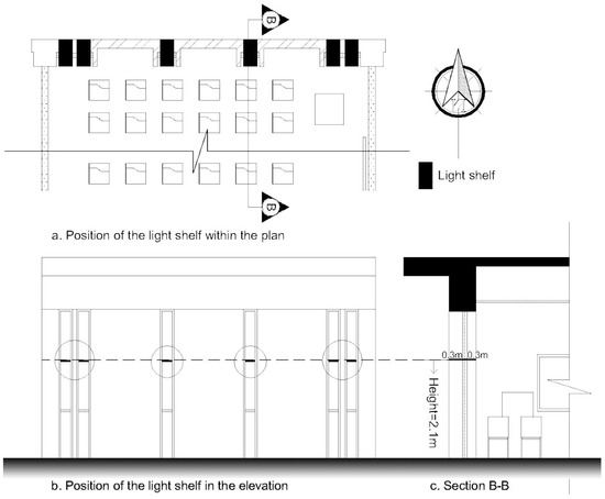 Figure 8. Lightshelves’ location within the plan, elevation, and section of the classroom. - Case No.4: In this case, three anidolic ducts were installed between the false ceiling and the concrete slab, as shown in Figure 9. The anidolic duct was made of stainless steel, with an internal reflectance value is 0.95. The duct extended 1.6 m outside the windows to the north, and it ended at the deeper side of the classroom, as shown in Figure 10. The entry aperture of the anidolic duct was 0.63 m × 0.7 m, while the exit aperture was 1.0 m × 0.7 m. The duct was sealed with a single-pane glass of 0.9 VLT on both entry and exit apertures. The height of the duct was 0.5 m.
