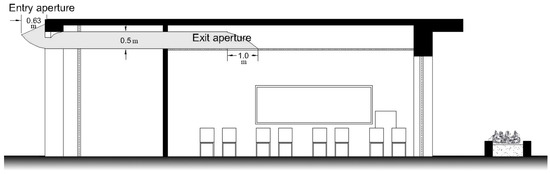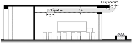 Figure 10. Section in a typical classroom showing the suggested northern anidolic ducts. - Case No.5: In this case, three anidolic ducts were installed between the false ceiling and the concrete slab. The anidolic ducts were made of stainless steel and had an internal reflectance value of 0.95. The ducts in this case, shown in Figure 11 and Figure 12, differed from the ducts in Case No.4 only by direction (to south). The exit apertures were the same for Case No.4 and Case No.5. As in Case No.4, the entry and exit apertures were sealed with a single-pane glass of 0.9 VLT.