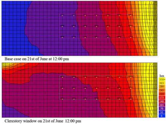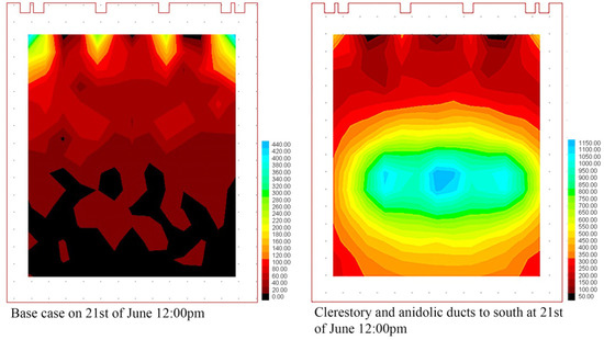 The results of the IES VE (FlucsDL) and Radiance simulations were shown as illuminance readings accompanied with contour lines. The simulation results of the suggested cases, conducted at selected times, were compared to the base case on the horizontal and vertical planes, as the examples shown in Figure 13 and Figure 14.