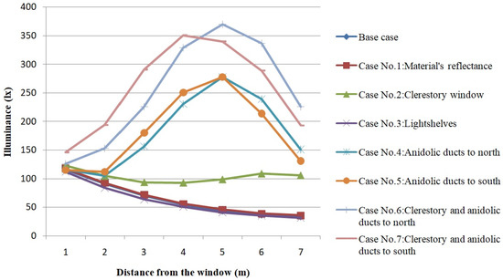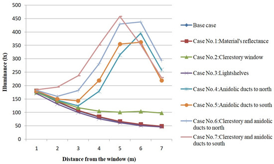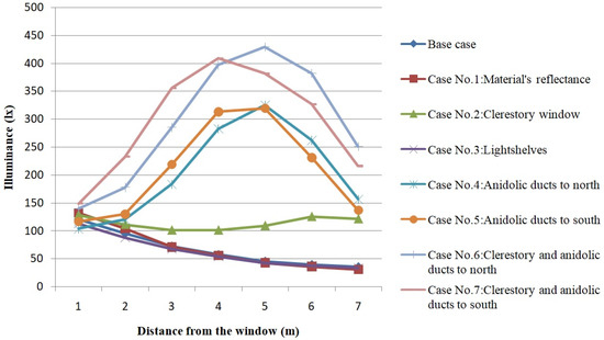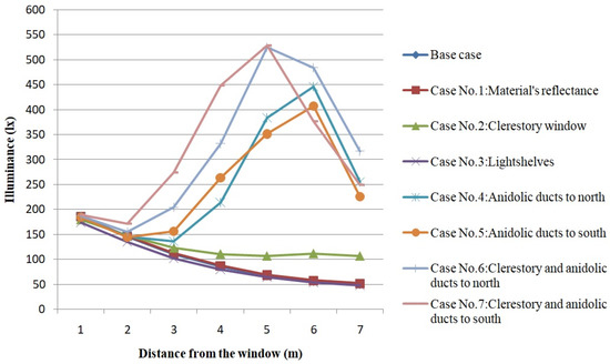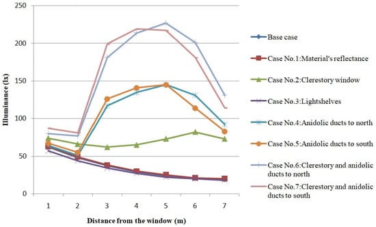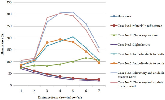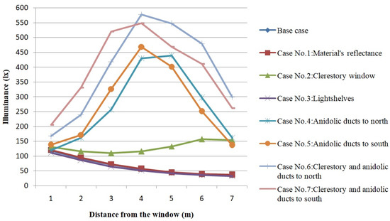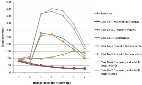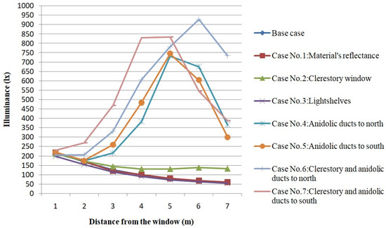 Figure 26 shows the comparison of illuminance levels of the suggested cases and the base case on the vertical plane in all simulated times. According to the figure, the cases that showed better illuminance levels than the base case were the clerestory window (Case No.2), anidolic ducts to north (Case No.4), anidolic ducts to south (Case No.5), the combination of clerestory and anidolic ducts to the north (Case No.7), and the combination of clerestory and anidolic ducts to the south (Case No.6), respectively. Case No.1 did not introduce any improvement, while Case No.3 reduced the illuminance on the vertical plane.