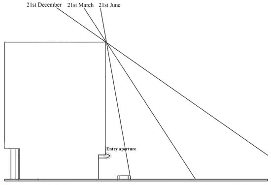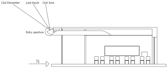 Solar altitudes of 21st of March, June, and December in relation to the entry aperture of the northern anidolic ducts.