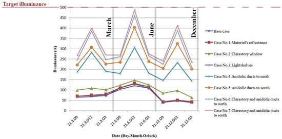 The figures show that Case No.1 impact was barely noticed. This was due to the absence of direct sunlight and the direction of windows toward the north. This agrees with what was found by a study on the influence of the reflectance values of materials when windows are northerly oriented [38]. The absence of direct sunlight led also to a reduction of the illuminance levels inside the classroom in Case No.3. The lightshelves worked as shading devices and prevented indirect sunlight entry instead of reflecting more daylight into the classroom [39]. The base case, Case No.1, Case No.2, and Case No.3 did not meet the target illuminance required in the classroom at any simulation time.